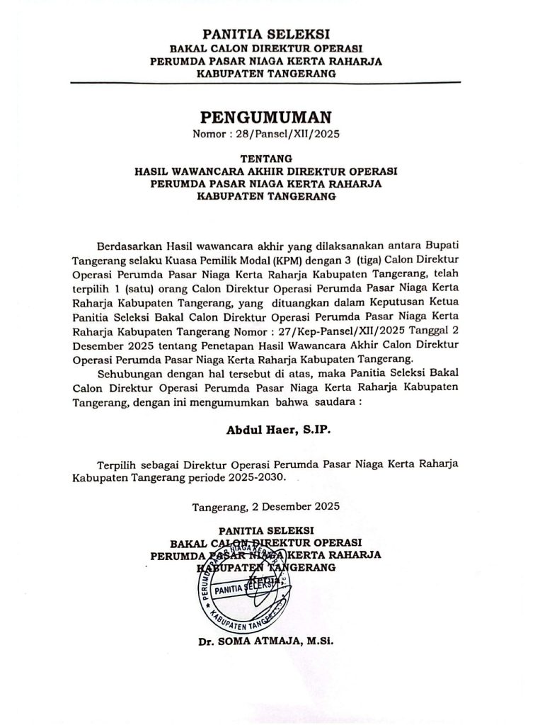 Panitia Seleksi Bakal Calon Direktur Operasi Perumda Pasar Niaga Kerta Raharja Kabupaten Tangerang telah menyelesaikan rangkaian proses seleksi dan wawancara akhir bersama Kuasa Pemilik Modal (KPM). Melalui proses yang transparan, akuntabel, dan sesuai ketentuan yang berlaku, panitia kini menetapkan hasil akhir seleksi sebagaimana tercantum dalam pengumuman resmi berikut.